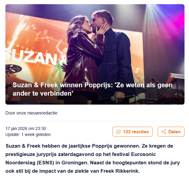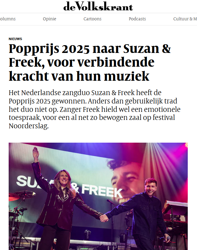 Suzan & Freek zijn de winnaar van de Popprijs 2025. Het duo ontving zojuist uit handen van presentatoren Vera Siemons en Justin Verkijk de meest prestigieuze prijs voor Nederlandse popmuziek tijdens Noorderslag, onderdeel van festival ESNS. Volgens de jury weten Suzan & Freek als geen ander de Nederlandse bevolking te verbinden, van alle leeftijden en uit alle lagen van de samenleving. De Popprijs, georganiseerd door Buma Cultuur, ESNS en Kunstenbond/Ntb, bestaat uit een geldbedrag van 10.000 euro en een beeld van Theo Mackaay. De bekendmaking was live te zien bij de NTR op NPO 3, te horen op NPO 3FM en te zien via de livestream van het festival.