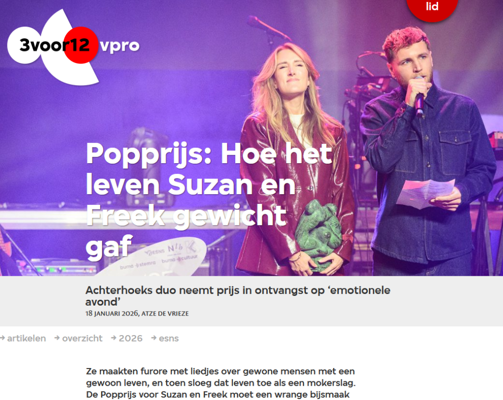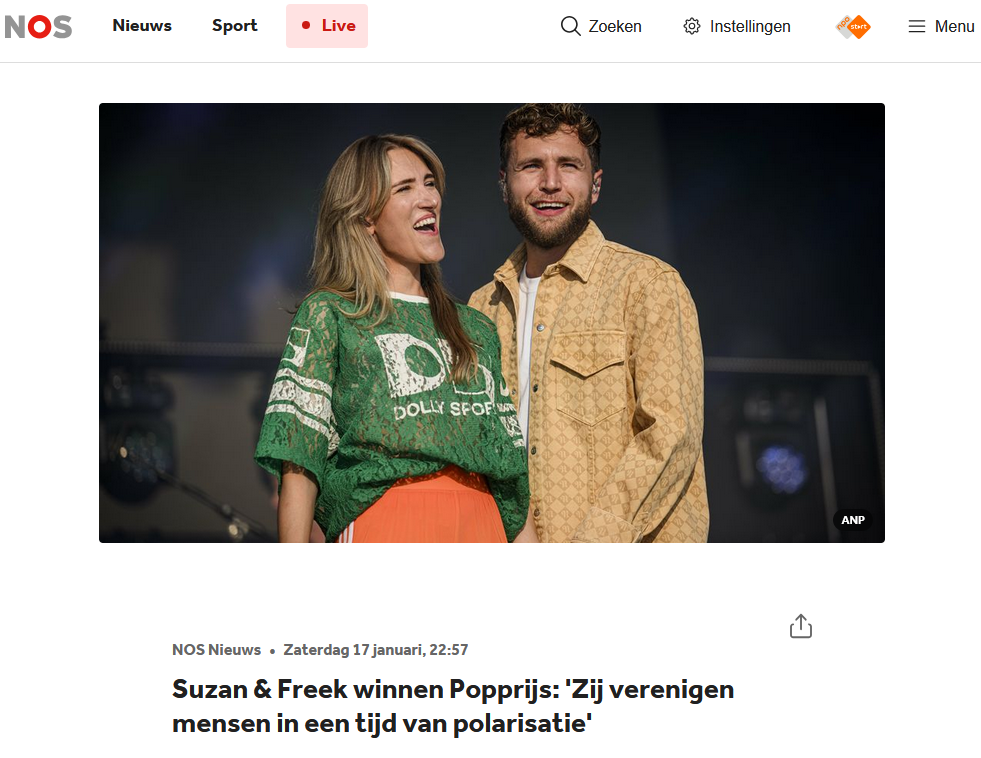 Tegen die achtergrond bleef het duo in verbinding staan met hun fans. Op het podium, maar ook via nieuwe muziek en online. Zij brachten licht via radio, streaming en concerten en deelden hun boodschap van verbinding, omkijken naar elkaar en menselijke connectie. Daarmee wisten ze Nederlanders van alle leeftijden en uit alle lagen van de bevolking te raken en iets teweeg te brengen in de samenleving, tot koningin Máxima aan toe. Suzan & Freek verenigen mensen in een tijd van polarisatie. Zo maakte het duo de grootste impact op de Nederlandse popmuziek in 2025.